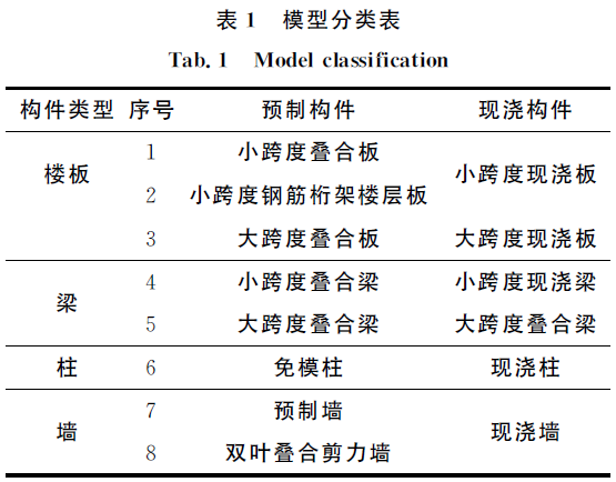 首先對(duì)柱、梁、板、墻四種構(gòu)件的現(xiàn)澆與裝配式模型進(jìn)行建模及內(nèi)力和配筋計(jì)算,根據(jù)計(jì)算結(jié)果設(shè)計(jì)預(yù)制構(gòu)件施工方案.分類情況見表1。